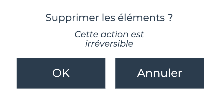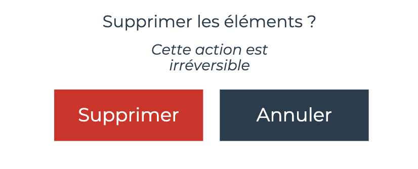 Les termes « OK » et « Annuler » ne sont pas clairs. La plupart des utilisateurs se demanderont « Que va-t-il se passer si je clique sur « Annuler » ? ». Pour éviter toute confusion, il est préférable d’utiliser l’intitulé « Supprimer » plutôt qu’un simple « OK ». Cela permet de clarifier l’action du bouton. Pour encore plus de clarté, si « Supprimer » est une action potentiellement dangereuse, vous pouvez utiliser la couleur rouge pour l’indiquer et donc prévenir l’utilisateur.