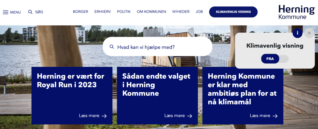 Sur le site de cette commune Danoise, vous avez le choix de choisir un « affichage respectueux du climat » qui vous permet de réduire l’emprunte carbone des pages de ce site.