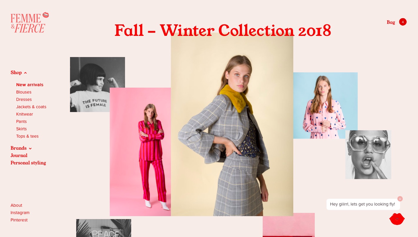 Première différence qui saute aux yeux, la couleur n’est plus bannie. Elle s’affiche en fond de page, sans complexe, et vient chasser le sempiternel blanc, couleur neutre par excellence, que l’on trouve encore sur la plupart des sites. Il a même disparu des photos de Femmeandfierce.nl, remplacé par des teintes pastels et chaleureuses, « girly » ? Pire encore ! Le sacro-saint noir des typos a été outrageusement remplacé par un rouge bien primaire, sorti tout droit d’une affiche vintage des années 70 !