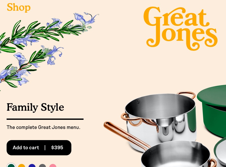 Qui l’eut cru ? Le dessin, ou plutôt les éléments dessinés, reviennent en force. Avec assez d’habileté sur Greatjonesgoods.com où ils viennent se superposer à la photo ou même la remplacer. Soulevez le couvercle des marmites et vous serez surpris. Encore une fois, il ne s’agit pas de ces illustrations, chères à Google, policées, trop honnêtes pour être authentiques, calibrées au pixel près, mais bien de bons vieux dessins tracés à la main, sans algorithme pour lisser le trait, peut-être, scannés, puis collés comme des images de classe sur un grand Canson coloré. On peut aimer ou pas, mais l’effet est réussi. Voilà enfin quelque chose de nouveau et de différent qui donne un petit ton amateur sympathique, et accroche le regard.