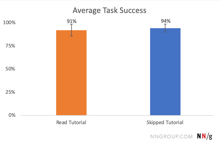 Que les gens lisent ou pas le tutorial, leur taux de réussite est le même et le temps pour accomplir les tâches également. Même si il existe des différences mineures, comme l’indique NNG, celles-ci ne sont pas représentatives et semblent plaider pour l’inutilité des tutoriaux.