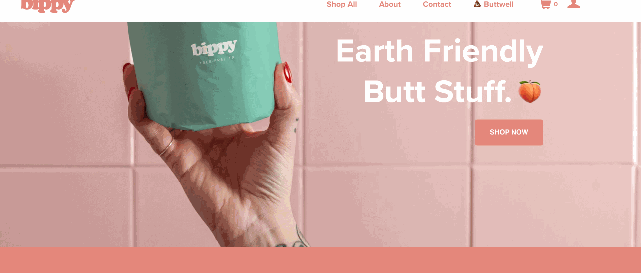 Commençons par Hey Bippy. Un site qui se définit comme “une ligne de produits de soins personnels modernes destinée exclusivement aux fesses et dont la mission est de préserver les forêts de fond en comble.”.