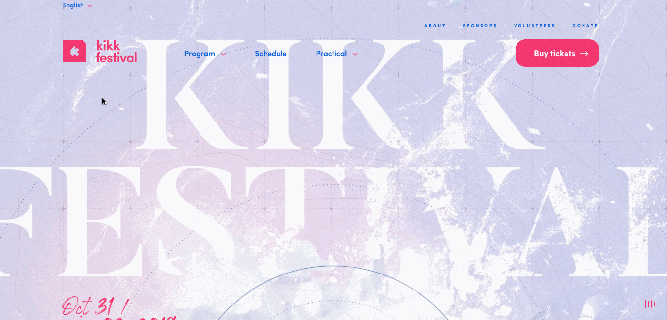 Le site Kikk festival nous plonge directement dans l’ambiance avec un son ambiant de vent frais qui s’estompe dès qu’on scroll sur la page. Le style de site est en cohérence avec l’univers de l’évènement, dynamique et très créatif. Les dates, le lieu et le CTA d’achat de billets sont facilement visibles une fois sur le site. C’est clair, net et précis, tout comme les informations concernant le nombre de speakers, de visiteurs, de workshops et de démos.