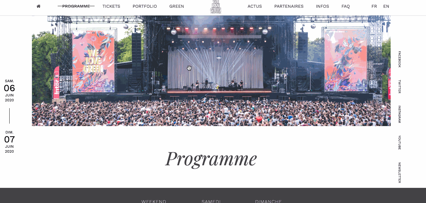 Festival à Paris, le We Love Green est organisé au bois de Vincennes et veut allier musique et respect de l’environnement. Et ça se voit tout au long de la navigation sur le site avec des paragraphes assez courts, un design assez aéré. Même si l’image prend le pas sur le texte lorsqu’on scroll, arrêtez-vous sur l’une d’elles et vous verrez le texte réapparaître sous l’image. Tout comme sur le site Øya Festival, les dates sont toujours visibles en sticky sur la gauche.