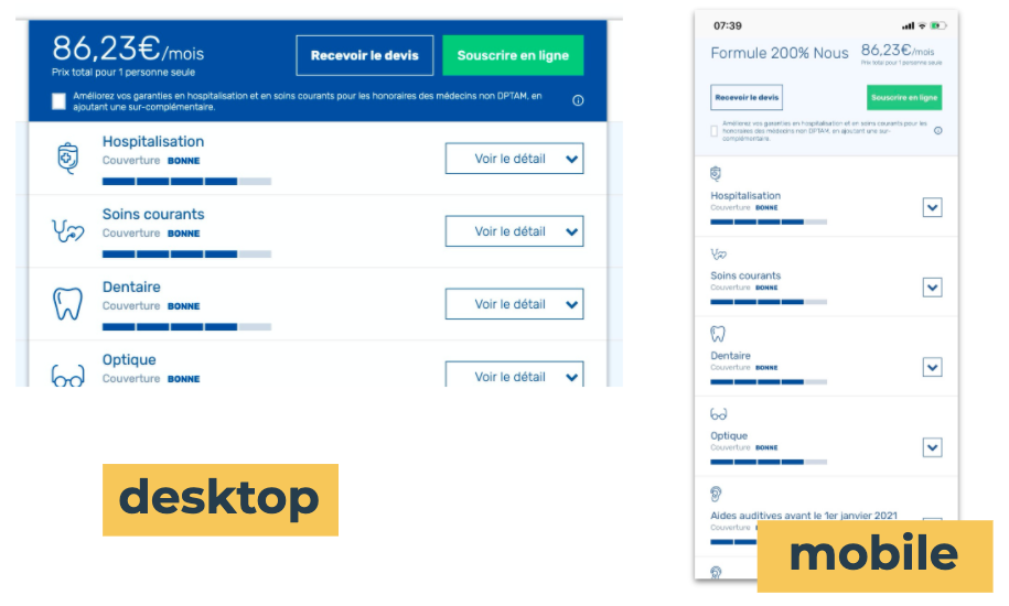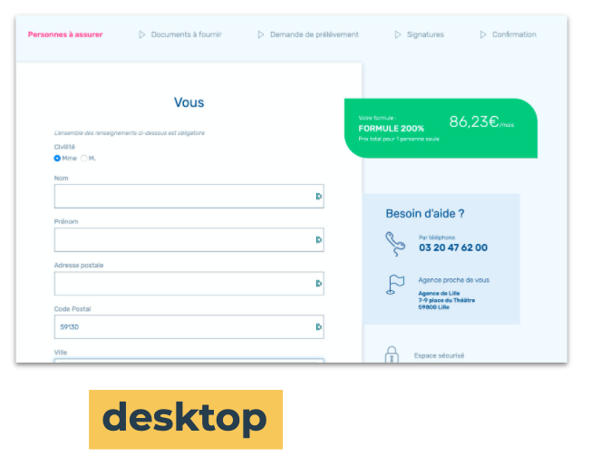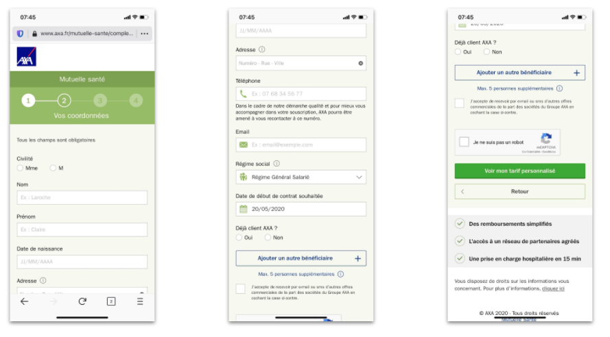 Dans le cas des assurances et mutuelles se pose la question du numéro de téléphone ainsi que de l’e-mail. Et plus vous faites preuve de transparence, plus les utilisateurs auront confiance en votre interface. Vous aurez alors plus de chance de recueillir un vrai numéro de téléphone ainsi qu’une vraie adresse e-mail.