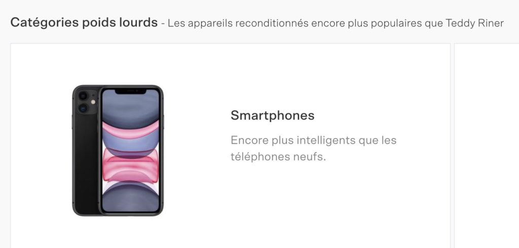 On retrouve exactement le même procédé sur Backmarket.fr. Le ton et le style des textes donnent toute sa saveur à ce site de produits d’occasion (tiens, tiens, encore un site de produits d’occasion, est-ce un hasard ?).