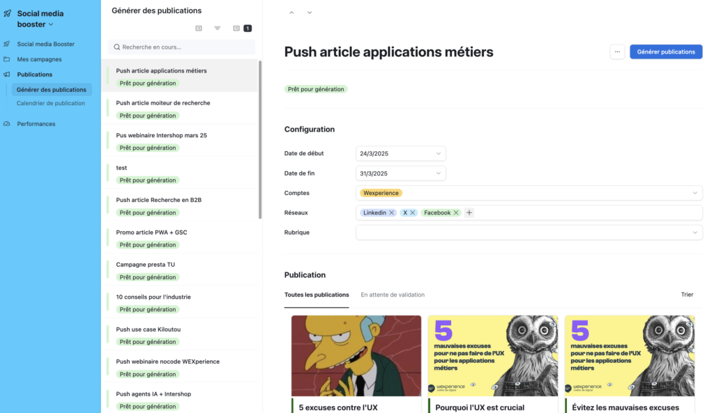 Chez Wexperience, quand nous avons pensé à concept pour développer notre visibilité sur les réseaux sociaux, nous avons immédiatement pensé à un couple Airtable + Make + chatGPT. Le choix de Airtable impliquait que toutes les interfaces utilisateurs soient celles de Airtable. Il était donc très difficile d’en maîtriser l’UX, mais cela n’a pas empêché de démontrer le concept auprès des premiers utilisateurs.