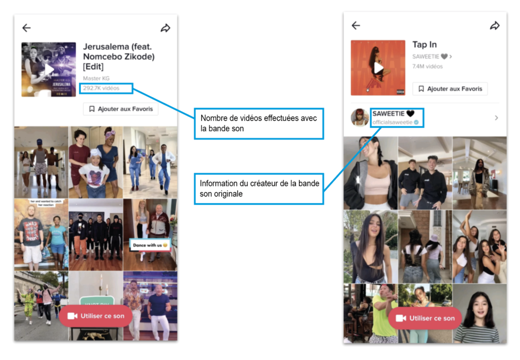Aussi, la page audio permet aux utilisateurs de savoir le nombre de personne qui a déjà créé du contenu à partir de telle ou telle musique. Si des milliers d’utilisateurs ont créé une vidéo à partir d’une bande son particulière, de nombreux créateurs de contenu voudront en faire de même ! Les utilisateurs voit cela comme un défi 😉