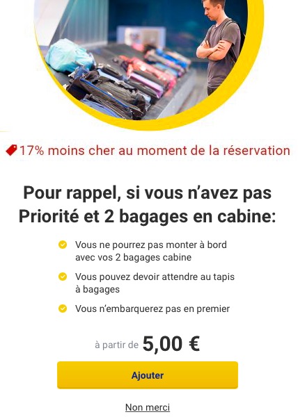 J’en prends pour témoin l’expérience que j’ai vécue récemment sur le site d’une compagnie aérienne low-cost. Fort d’une offre attractive qui tire sur les prix, son objectif est de bonifier le panier moyen à l’aide d’options que l’utilisateur peut refuser de prendre ou pas. La technique est vieille comme le monde. On attire les mouches avec un prix bas et on tente à tout prix de leurs soutirer quelques euros par ci par là pour générer de la marge. Rien de répréhensible à cela, sauf qu’à force d’utiliser des messages flous, inquiétants, ou de faire payer pour des services qui n’en sont en réalité pas, on peut se demander où une telle stratégie mène quand à la fidélisation de la marque.