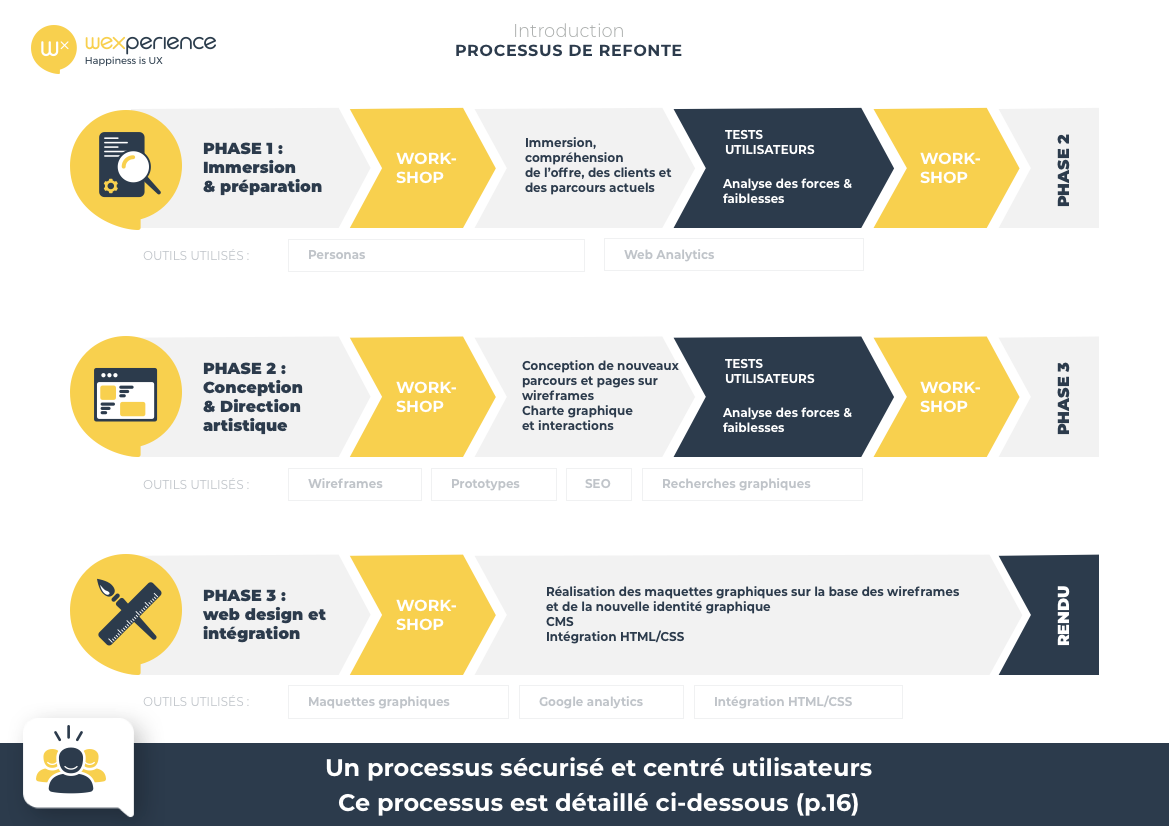Comme vous pouvez le voir – et c’est très important – le projet est « entrecoupé » de tests utilisateurs. Et c’est là réellement que réside notre principale source d’innovation et d’inspiration. C’est bien lors de ces sessions avec les clients finaux que nous arrivons à déterminer dans le détail ce qui pourrait permettre d’améliorer l’expérience utilisateur, et, in fine, la performance commerciale de la page, comme nous le verrons à la fin de cet article.