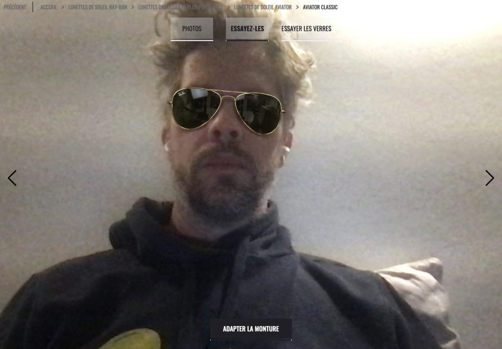 C’était sans doute une des premières applications viables et c’est Rayban qui a sans doute lancé cette possibilité, qui atteint aujourd’hui un niveau de réalisme suffisant pour en faire un outil convaincant. Chaque fiche produit de lunettes permet de faire un essai virtuel. Et c’est plutôt très convaincant, même si sur la photo ci-dessous, on a l’impression que Olivier, notre boss, sort de prison 🙂