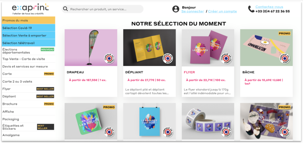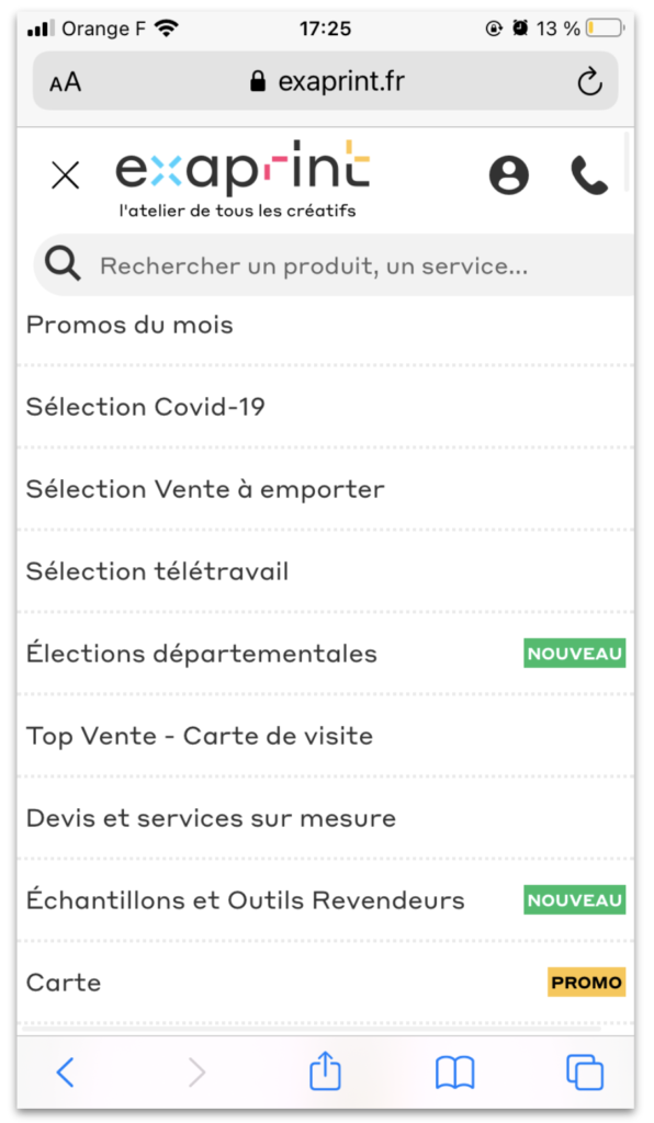 Sur le site Exaprint, réalisé par Wexperience, les choix de conception visuelle sont les mêmes sur desktop que sur mobile. On retrouve dans le menu les mêmes catégories.