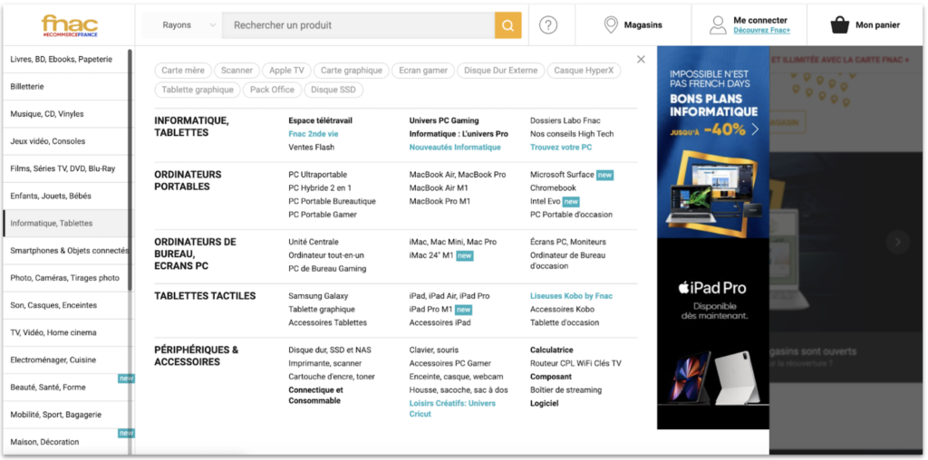 Le menu vertical du site la Fnac permet de proposer un nombre important de catégorie aux utilisateurs.