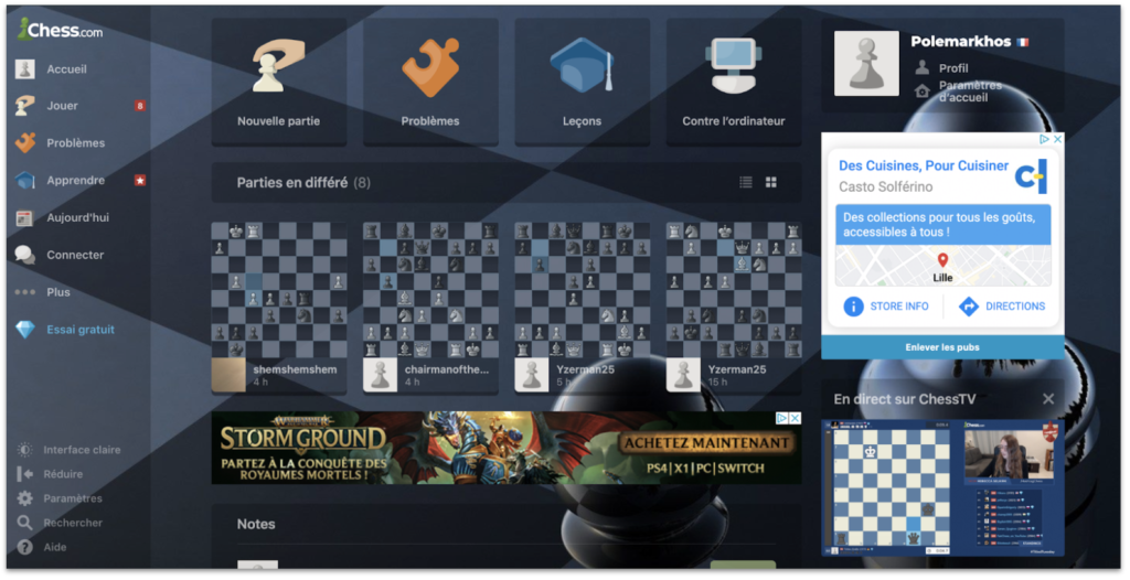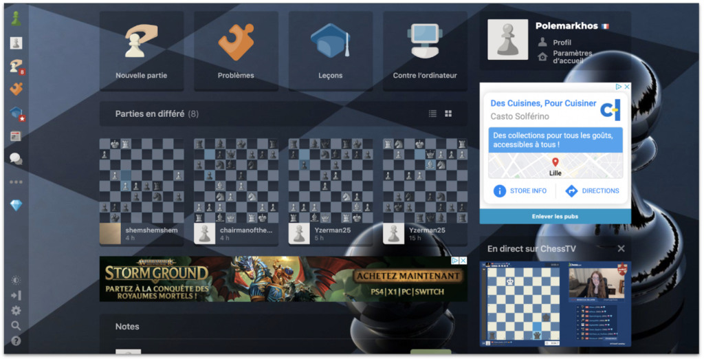 Le site d’échec Chess propose à ses utilisateurs un menu vertical avec des icônes, mais il est possible d’y ajouter via une option les libellés, ce qui est une excellente chose pour les joueurs débutants qui ne connaissent pas encore l’interface.