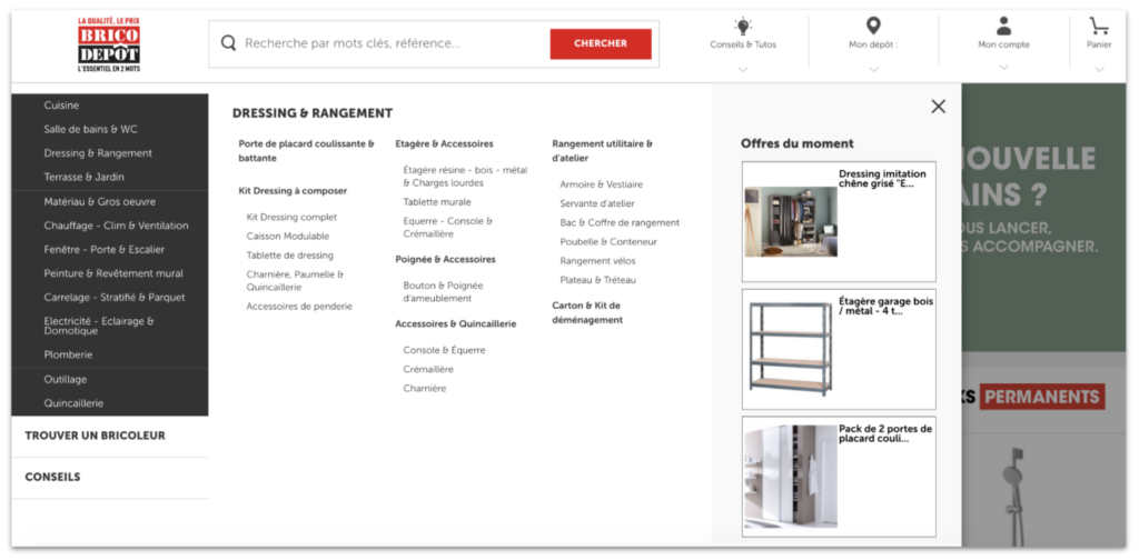 Le menu vertical de Brico Depôt propose des catégories et sous-catégories précises de manière à bien orienter l’utilisateur.