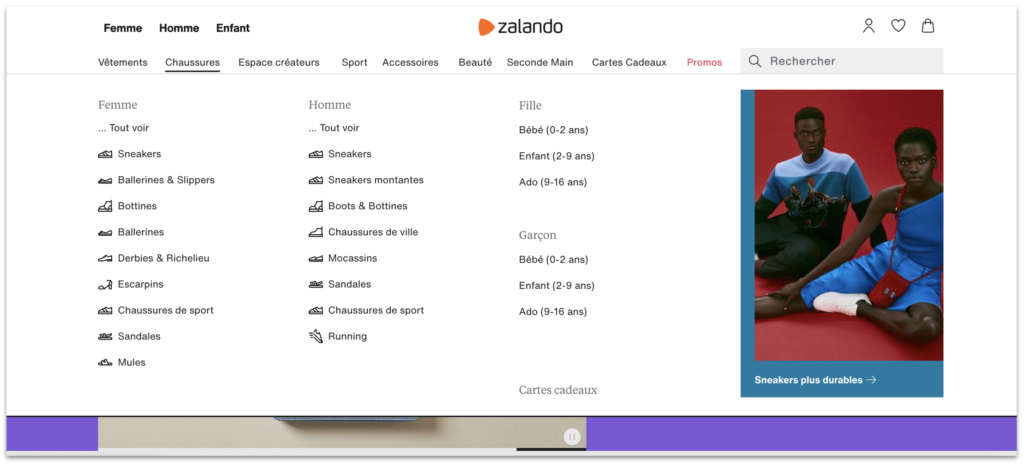- Justifiez à gauche les éléments de navigation. Dans les pays occidentaux, on lit de gauche à droite. Alors, pour améliorer la lisibilité de votre site, utilisez des éléments de navigation justifiés à gauche comme le montre l’exemple de Zalando ci-dessous.